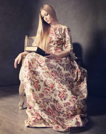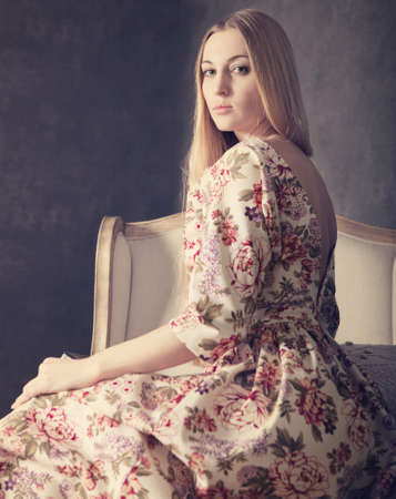 Portrait of the beautiful blond girl in long dress in living room