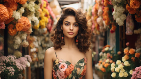 A beautiful young woman posing in front of floral-decorated flower shops