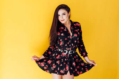 Beautiful brunette woman demonstrating spring clothes.