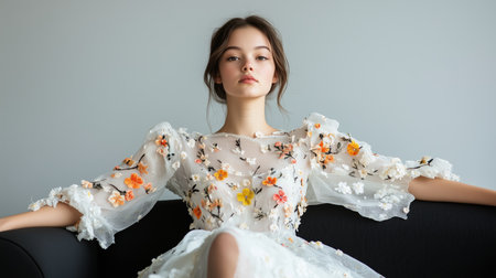 Young woman poses elegantly on a sofa wearing a floral embroidered dress indoors