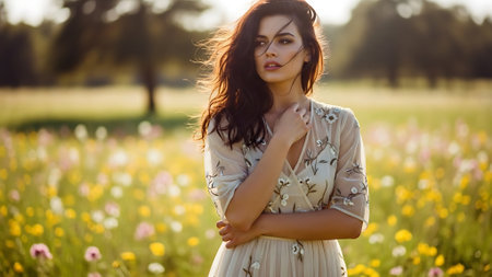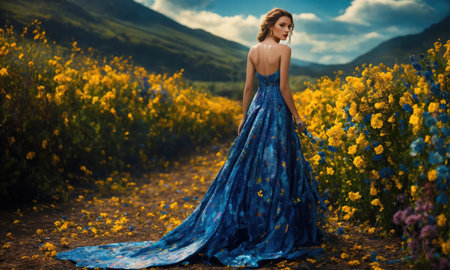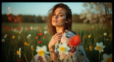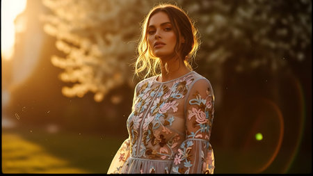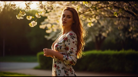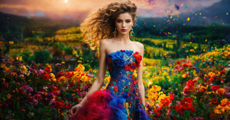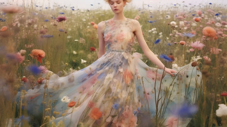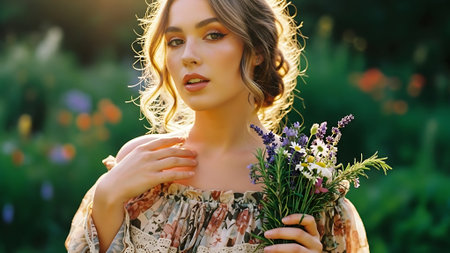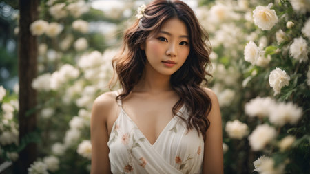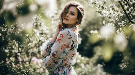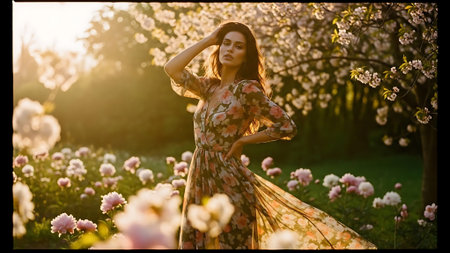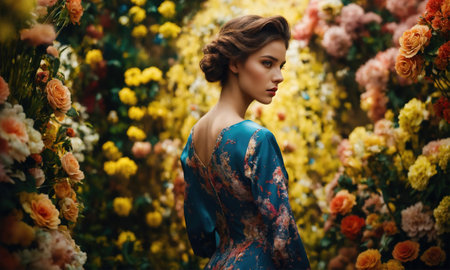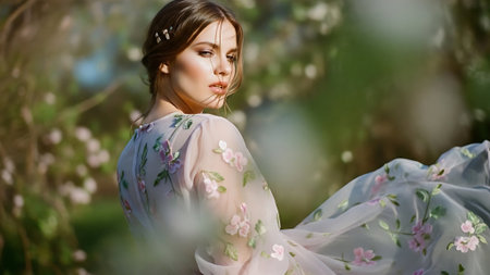 Romantic portrait of a woman in a flowing dress, surrounded by blooming flowers