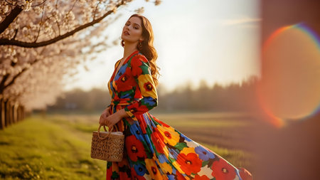 Beautiful young woman in colorful dress walking in blooming garden.