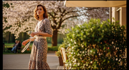 A woman in a floral dress enjoying a glass of wine outdoors
