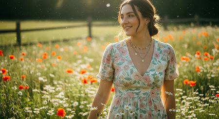 A young woman in a floral dress standing in a field of poppies and daisies