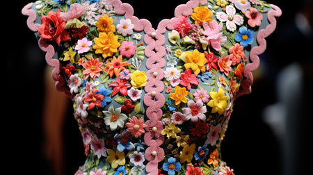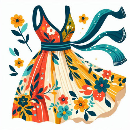 Vector illustration of a beautiful dress decorated with flowers and ribbons.