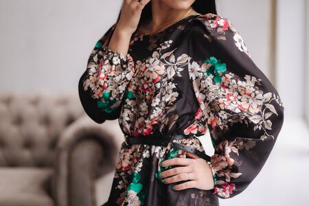 Portrait of a beautiful fashionable woman in a black dress with flowers