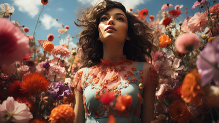 Blonde woman amidst vibrant flowers under a blue sky, capturing nature's beauty and ethereal elegance.
