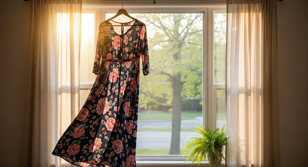 A beautifully designed floral dress on a mannequin, set in an outdoor space drenched in soft sunlight, ideal for showcasing trendy fashion and design.