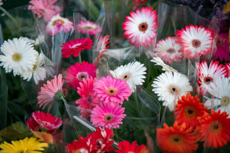 Bunch of Pink tulips white gerbera daisy bouquet of mixed flowers. Fresh spring Summer background