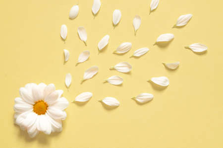 Spring or summer background with copy space for text. Chamomiles white flower with yellow heart and petals. Top view. Flat lay.