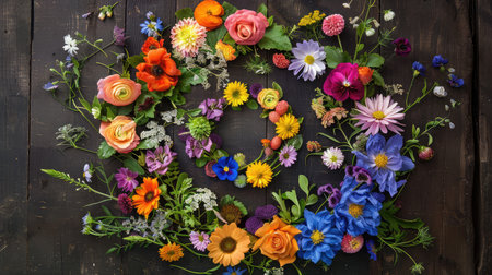 Assorted summer flowers arranged in a spiral pattern on a dark wooden floor, capturing the season beauty.