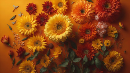Flowers composition on orange background. Flat lay, top view, copy space. generative ai