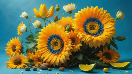 Bouquet of sunflowers and lemon on blue background. generative ai