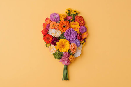 Colorful heart shaped flower arrangement on a yellow background, showcasing vibrant seasonal blooms and evoking feelings of love and joy