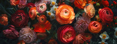 a big flower bouquet featuring ranunculus and narcissus, their colorful blooms bursting with freshness and charm