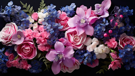 Beautiful vibrant and colorful flowers on a dramatic black background, captured from a topdown perspective