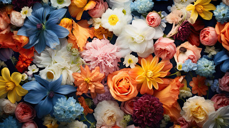 A vibrant texture of various blooming flowers presenting a beautiful and colorful floral assortment
