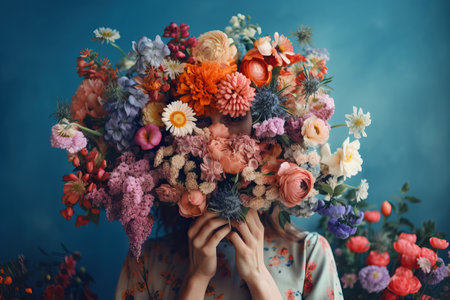 Crop anonymous person demonstrating bunch of colorful flowers against blue background. Generative AI