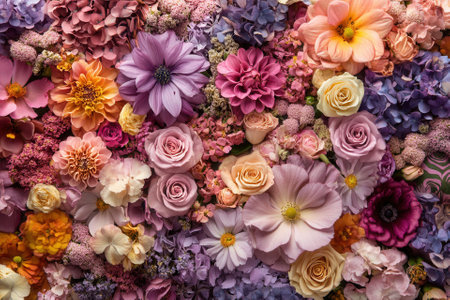 A vibrant texture of various blooming flowers presenting a beautiful and colorful floral assortment