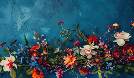 Colorful floral arrangement on blue textured background for creative design