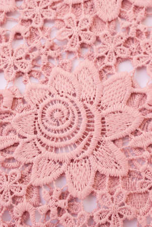 White lace on a pink background. Copy space. Top view.