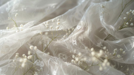 Macro shot of delicate white lace fabric with floral embroidery, intricate and luxurious, showing detailed needlework.