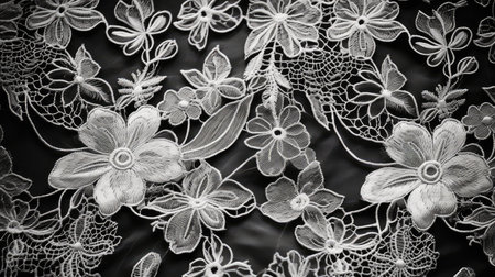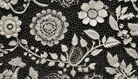Fine lace texture, delicate white floral patterns against a dark surface, intricate and elegant
