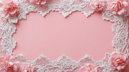 A soft and delicate floral lace pattern in white on a pastel pink background, evocative romance and elegance.