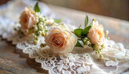 A classic bridal bouquet of white roses with delicate greenery, lying on a lace fabric