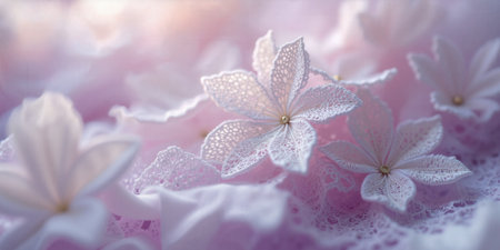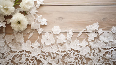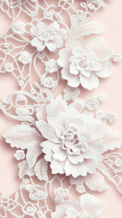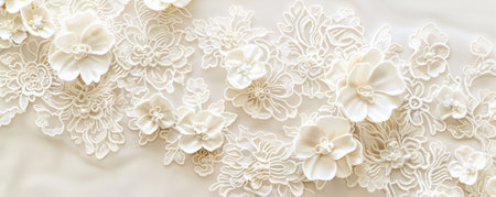 An AI generated illustration of A close-up view of a white lace textile with flowers and pearls adorning the edges, placed on a solid background