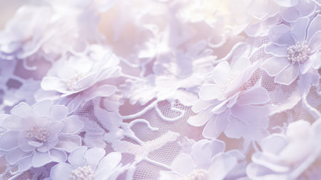 Delicate lace patterns in pure white overlay a pastel lilac base, creating intricate floral motifs; close-up shot with diffused lighting