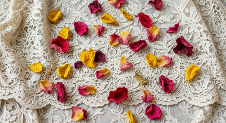 A close up of a lace tablecloth with flowers on it, AI