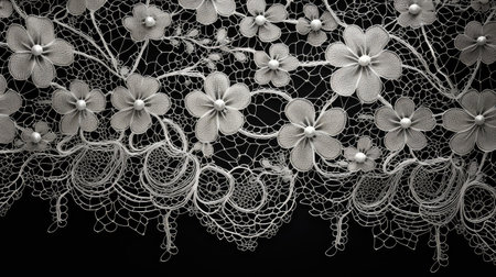 lace from white flowers on a black background, inspired by the style of iris van herpen. this organic material, captured by camille vivier, showcases delicate hand-painted details in light white and light beige. the intricate design, reminiscent of david burdeny's attention to detail, adds a touch of elegance and sophistication to any setting. ai generated