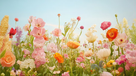 A diverse array of wildflowers showcases bright colors in a meadow. The scene captures the beauty of nature during the peak of spring, with hues of pink, yellow, and blue.
