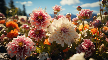 Vibrant flower garden landscape with colorful blossoms in bloom