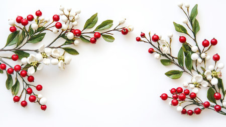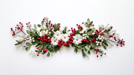 Aesthetic Christmas decoration with green branches, red and white berries and flowers, copy space. Generative AI.