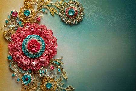 Colorful floral pattern with intricate designs on teal background. That the image is generated using AI.