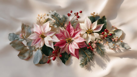 A stunning arrangement of pink and white poinsettias complemented by greenery and berries, set against a soft silk background. Perfect for seasonal decor.