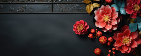 Frame made of red flowers on dark background with copy space. Floral Chinese New Year decoration