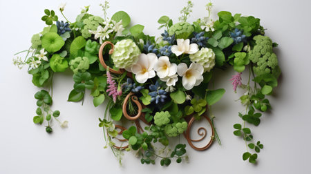 Imaginative floral and leaf pattern, flat lay of nature idea, flowery greeting card, vibrant spring floral backdrop, room for text, and contemporary natural decor design. GENERATE AI