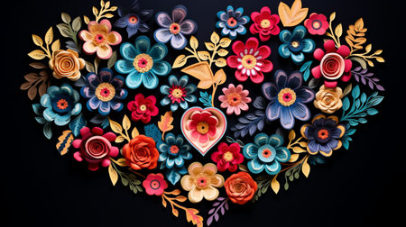 a vibrant floral heart-shaped paper cutout, blending mexican and american cultures, is showcased against a flat black background. this uhd image captures the essence of colorful woodcarvings, charming illustrations, and captivating storytelling in its composition. ai generated
