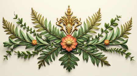 Elegant Victorian-style botanical ornament with intricate leaves, flowers, gold filigree details
