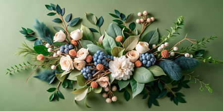 A beautiful flatlay featuring delicate white flowers, lush greenery, blue berries, and pinecones arranged artfully against a clean backdrop, perfect for seasonal decor.