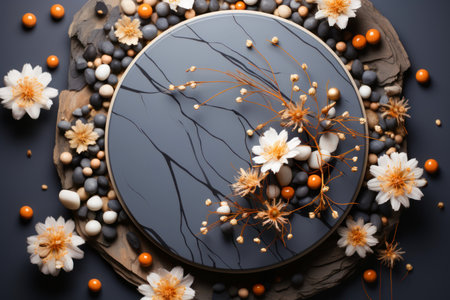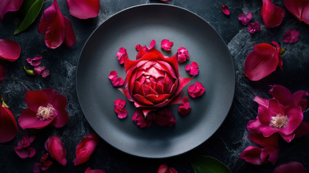 A captivating image of an elegant pink lotus flower placed at the center of a dark plate, surrounded by delicate petals, creating a serene and harmonious ambiance.