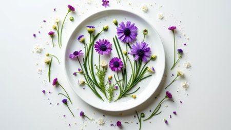 Purple flowers arranged on white plate surrounded by petals and buds. That the image is generated using AI.