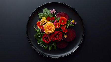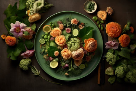 Stunning culinary art featuring a vibrant arrangement of edible flowers and fresh vegetables, ideal for promoting gourmet cuisine or creative food presentations.