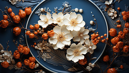An AI generated illustration of a white plate white cherry flowers on a green background