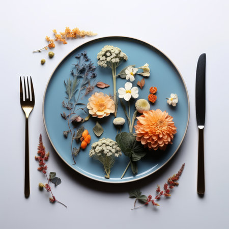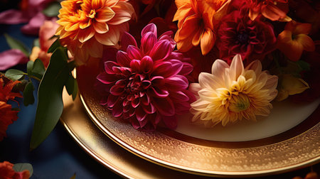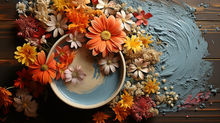 Vibrant floral arrangement with diverse flowers around white ceramic plate. That the image is generated using AI.