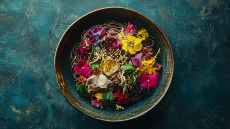 A stunning arrangement of noodles adorned with vibrant edible flowers in a rustic bowl. This visually appealing dish embodies freshness and creativity, perfect for gourmet presentations.