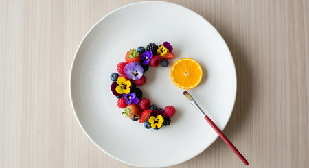 This stunning image showcases a vibrant assortment of fresh fruits and edible flowers artfully arranged in elegant plates. Perfect for highlighting healthy dining options and culinary creativity.